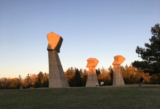 We were there just before the sun set, and the park was mostly deserted. There were a few scattered groups of people, a few families. Some sat at the picnic tables there. I watched a man and a boy who looked to be about eight years old kick a soccer ball back and forth for a while. It was a welcome sign of life in what is an incredibly bleak place in history. The boy would kick the ball as hard as he could into the side of one of the raised stone fists, and then watch it arc back over his head toward his father.