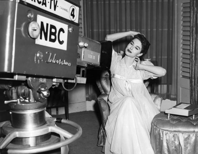 Or consider Count Sheep with Nancy Berg, a five-minute-long show that then aired at 1:00 AM in New York: "She emerges in a lavishly decorated bedroom clad in a peignoir, or negligee, minces around the room, stretches, yawns, jumps into bed, and then wriggles out again for a final romp with her French poodle. Then she crawls under the covers, cuddles up for the night, and composes herself for sleep. The camera pans down for an enormous close-up, and the microphones catch Miss Berg whispering a sleepy 'Good-night.' " In the New York Times article that Gordon and Wohl cite for these details, Berg is quoted as saying, "This is five little minutes of being myself, which is all I'd want to be anyway."