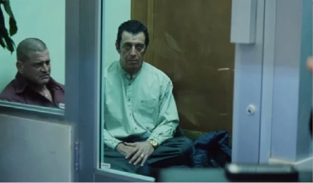 In my feed recently I’ve seen several meme-like deployments of the frame above, from the film Uncut Gems, in which Eric Bogosian’s character is trapped in a vestibule behind a bulletproof glass door. Adam Sandler’s character has locked him there to stall for time while he waits to see if he’ll win a large sports bet he’s placed with what’s essentially Bogosian’s money. The image seems to capture Bogosian’s begrudging resignation, the moment at which he realizes he has no choice but to sit there until Sandler’s scheme is done. It’s also the moment in the film when Sandler seems to believe that he’s won Bogosian over to his cause. Forced to bear witness to the audacious genius of his plan, Bogosian will have no choice but to respect his nerve.